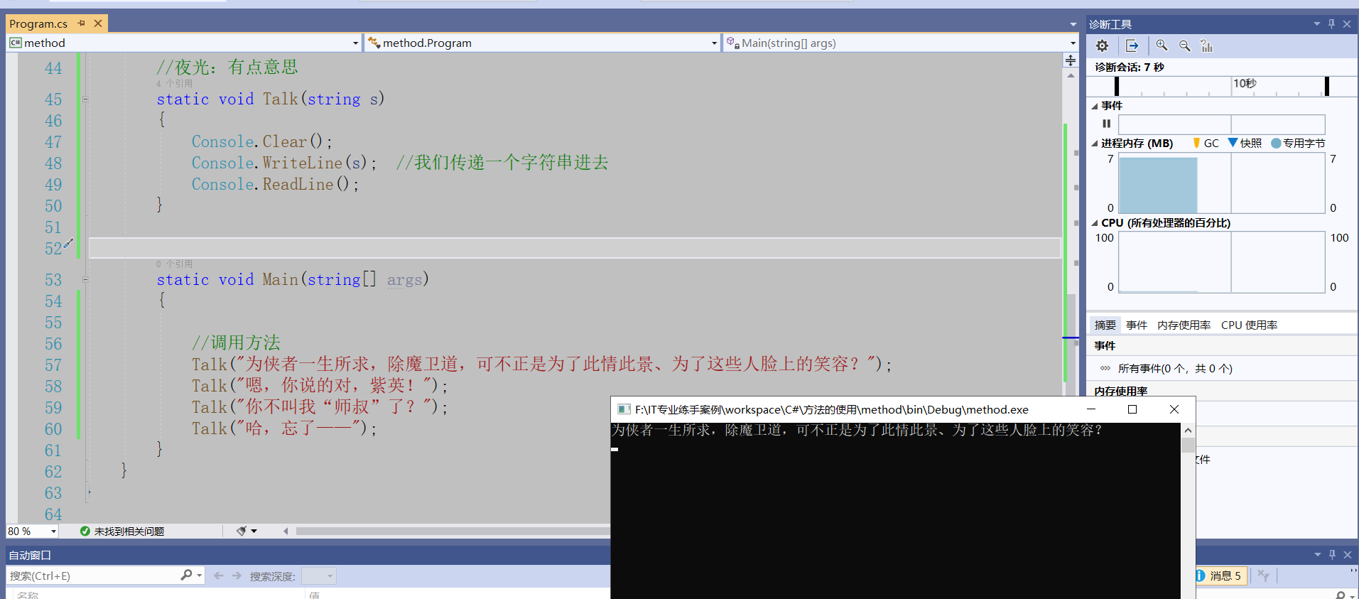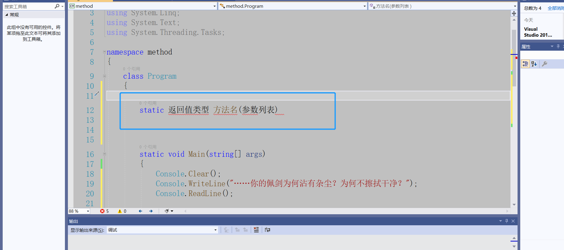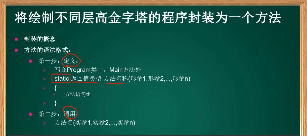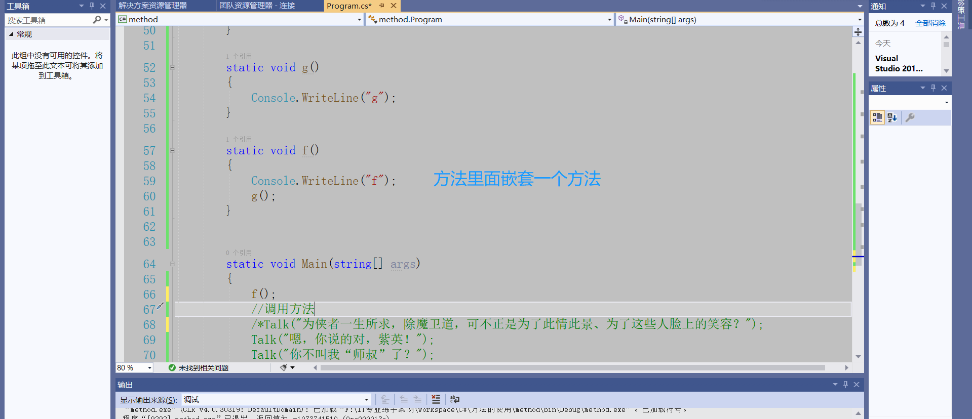 using System;using System.Collections.Generic;using System.Linq;using System.Text;using System.Threading.Tasks;namespace method{    class Program    {/*        static 返回值类型 方法名(参数列表)*/         //定义方法        static void Talk1()        {            Console.Clear();            Console.WriteLine("……你的佩剑为何沾有杂尘?为何不擦拭干净?");            Console.ReadLine();        }        //定义方法        static void Talk2()        {            Console.Clear();            Console.WriteLine("能用就好,反正一剑射出去没射偏就成了……");            Console.ReadLine();        }        //定义方法        static void Talk3()        {            Console.Clear();            Console.WriteLine("什么意思?平时如何使用这把剑?");            Console.ReadLine();        }        //定义方法        static void Talk4()        {            Console.Clear();            Console.WriteLine("我想想啊……");            Console.ReadLine();        }        //夜光:有点意思        static void Talk(string s)        {            Console.Clear();            Console.WriteLine(s);  //我们传递一个字符串进去            Console.ReadLine();        }        static void g()        {            Console.WriteLine("g");        }        static void f()        {            Console.WriteLine("begin f");            g();            Console.WriteLine("end f");        }        ///         /// 夜光:打三个杠,自动生成方法的说明框架        ///          /// 传入n        ///        返回1到n的和            static int Sum(int n)        {            //应该把这个结果返回给这个方法的调用者            int s = 0;            for(int i = 1; i <= n; i++)            {                s += i;            }            /* return 表达式*/            return s;        }        static void Main(string[] args)        {            int t;            t = Sum(11);            Console.WriteLine(t);           /* f();*/            //调用方法            /*Talk("为侠者一生所求,除魔卫道,可不正是为了此情此景、为了这些人脸上的笑容?");            Talk("嗯,你说的对,紫英!");            Talk("你不叫我“师叔”了?");            Talk("哈,忘了——");*/            Console.ReadLine();        }    }}