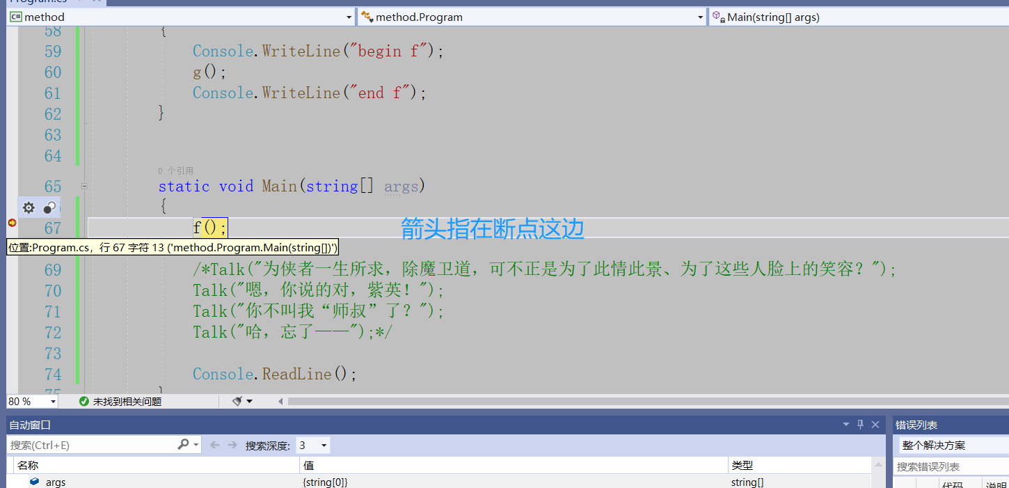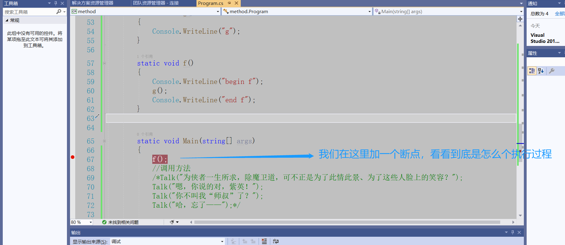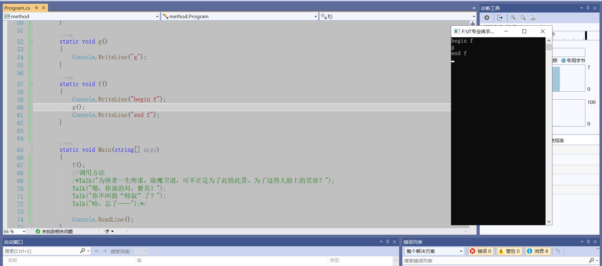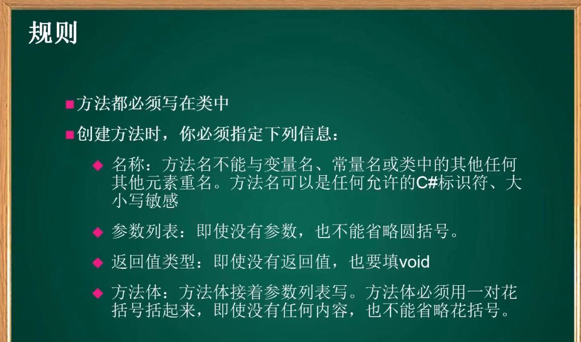 using System;using System.Collections.Generic;using System.Linq;using System.Text;using System.Threading.Tasks;namespace method{    class Program    {/*        static 返回值类型 方法名(参数列表)*/         //定义方法        static void Talk1()        {            Console.Clear();            Console.WriteLine("……你的佩剑为何沾有杂尘?为何不擦拭干净?");            Console.ReadLine();        }        //定义方法        static void Talk2()        {            Console.Clear();            Console.WriteLine("能用就好,反正一剑射出去没射偏就成了……");            Console.ReadLine();        }        //定义方法        static void Talk3()        {            Console.Clear();            Console.WriteLine("什么意思?平时如何使用这把剑?");            Console.ReadLine();        }        //定义方法        static void Talk4()        {            Console.Clear();            Console.WriteLine("我想想啊……");            Console.ReadLine();        }        //夜光:有点意思        static void Talk(string s)        {            Console.Clear();            Console.WriteLine(s);  //我们传递一个字符串进去            Console.ReadLine();        }        static void g()        {            Console.WriteLine("g");        }        static void f()        {            Console.WriteLine("begin f");            g();            Console.WriteLine("end f");        }        ///         /// 夜光:打三个杠,自动生成方法的说明框架        ///          /// 传入n        ///        返回1到n的和            static int Sum(int n)        {            //应该把这个结果返回给这个方法的调用者            int s = 0;            for(int i = 1; i <= n; i++)            {                s += i;            }            /* return 表达式*/            return s;        }        static void Main(string[] args)        {            int t;            t = Sum(11);            Console.WriteLine(t);           /* f();*/            //调用方法            /*Talk("为侠者一生所求,除魔卫道,可不正是为了此情此景、为了这些人脸上的笑容?");            Talk("嗯,你说的对,紫英!");            Talk("你不叫我“师叔”了?");            Talk("哈,忘了——");*/            Console.ReadLine();        }    }}