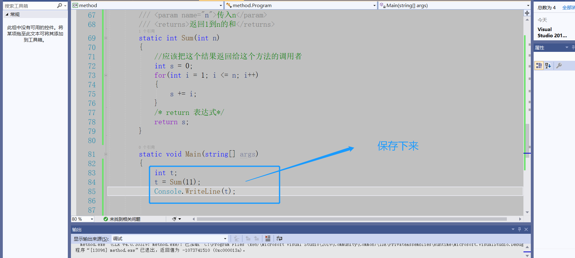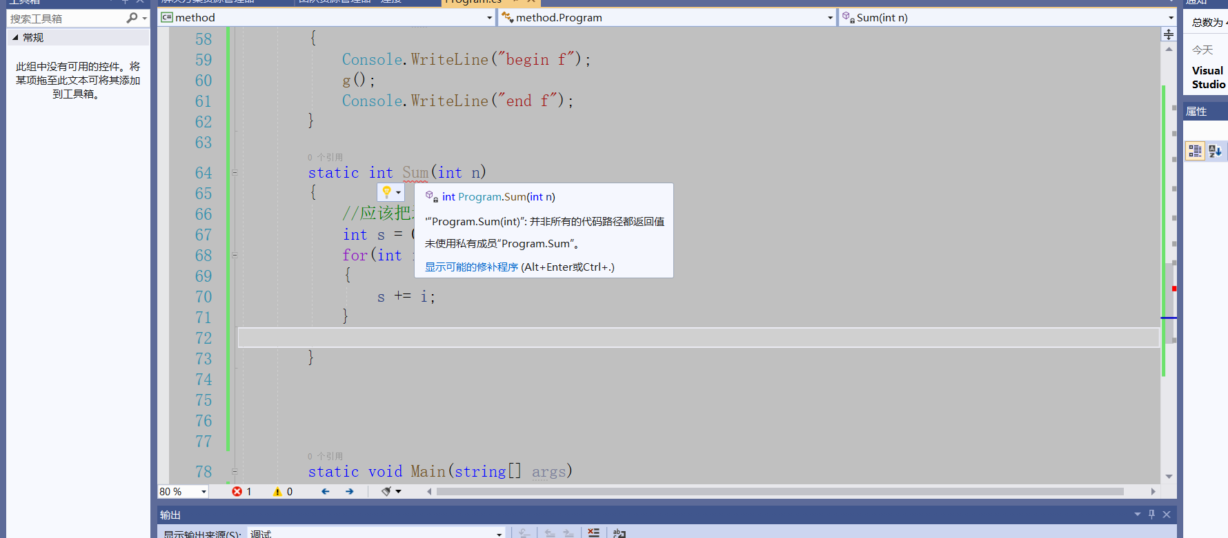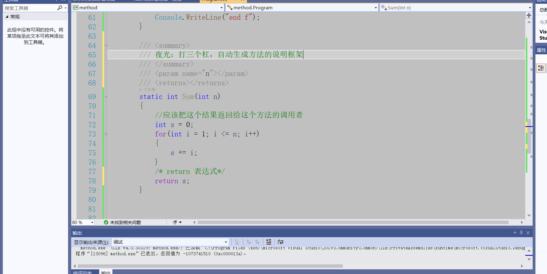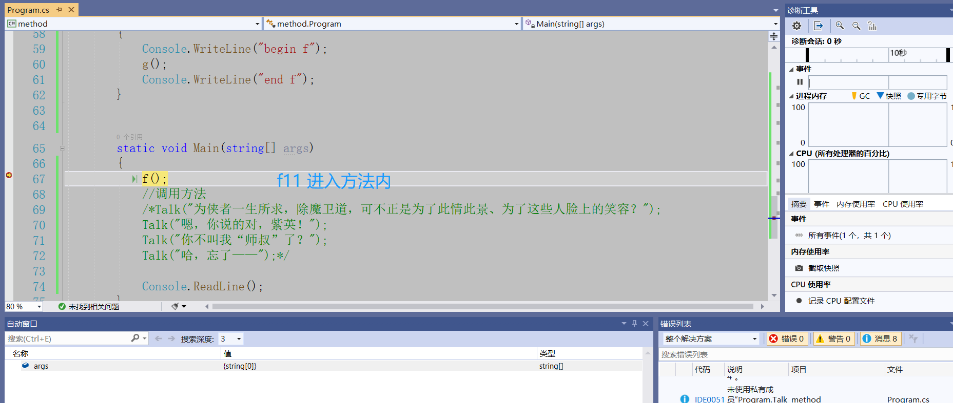 using System;using System.Collections.Generic;using System.Linq;using System.Text;using System.Threading.Tasks;namespace method{    class Program    {/*        static 返回值类型 方法名(参数列表)*/         //定义方法        static void Talk1()        {            Console.Clear();            Console.WriteLine("……你的佩剑为何沾有杂尘?为何不擦拭干净?");            Console.ReadLine();        }        //定义方法        static void Talk2()        {            Console.Clear();            Console.WriteLine("能用就好,反正一剑射出去没射偏就成了……");            Console.ReadLine();        }        //定义方法        static void Talk3()        {            Console.Clear();            Console.WriteLine("什么意思?平时如何使用这把剑?");            Console.ReadLine();        }        //定义方法        static void Talk4()        {            Console.Clear();            Console.WriteLine("我想想啊……");            Console.ReadLine();        }        //夜光:有点意思        static void Talk(string s)        {            Console.Clear();            Console.WriteLine(s);  //我们传递一个字符串进去            Console.ReadLine();        }        static void g()        {            Console.WriteLine("g");        }        static void f()        {            Console.WriteLine("begin f");            g();            Console.WriteLine("end f");        }        ///         /// 夜光:打三个杠,自动生成方法的说明框架        ///          /// 传入n        ///        返回1到n的和            static int Sum(int n)        {            //应该把这个结果返回给这个方法的调用者            int s = 0;            for(int i = 1; i <= n; i++)            {                s += i;            }            /* return 表达式*/            return s;        }        static void Main(string[] args)        {            int t;            t = Sum(11);            Console.WriteLine(t);           /* f();*/            //调用方法            /*Talk("为侠者一生所求,除魔卫道,可不正是为了此情此景、为了这些人脸上的笑容?");            Talk("嗯,你说的对,紫英!");            Talk("你不叫我“师叔”了?");            Talk("哈,忘了——");*/            Console.ReadLine();        }    }}