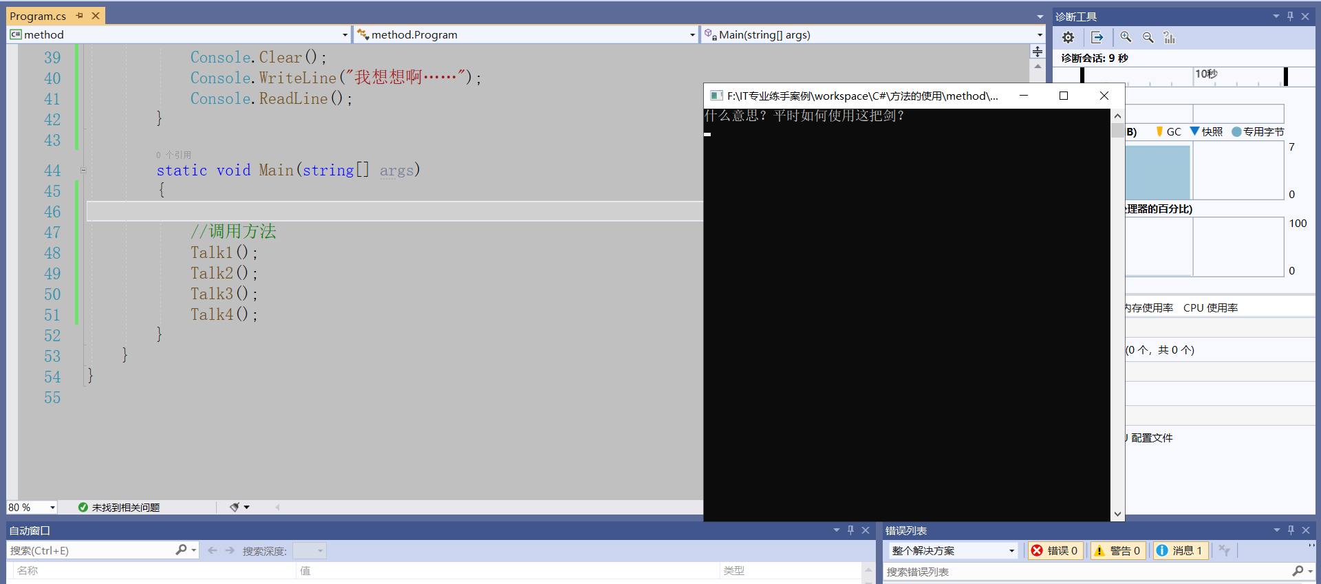 using System;using System.Collections.Generic;using System.Linq;using System.Text;using System.Threading.Tasks;namespace method{    class Program    {/*        static 返回值类型 方法名(参数列表)*/         //定义方法        static void Talk1()        {            Console.Clear();            Console.WriteLine("……你的佩剑为何沾有杂尘?为何不擦拭干净?");            Console.ReadLine();        }        //定义方法        static void Talk2()        {            Console.Clear();            Console.WriteLine("能用就好,反正一剑射出去没射偏就成了……");            Console.ReadLine();        }        //定义方法        static void Talk3()        {            Console.Clear();            Console.WriteLine("什么意思?平时如何使用这把剑?");            Console.ReadLine();        }        //定义方法        static void Talk4()        {            Console.Clear();            Console.WriteLine("我想想啊……");            Console.ReadLine();        }        static void Main(string[] args)        {            //调用方法            Talk1();            Talk2();            Talk3();            Talk4();        }    }}
